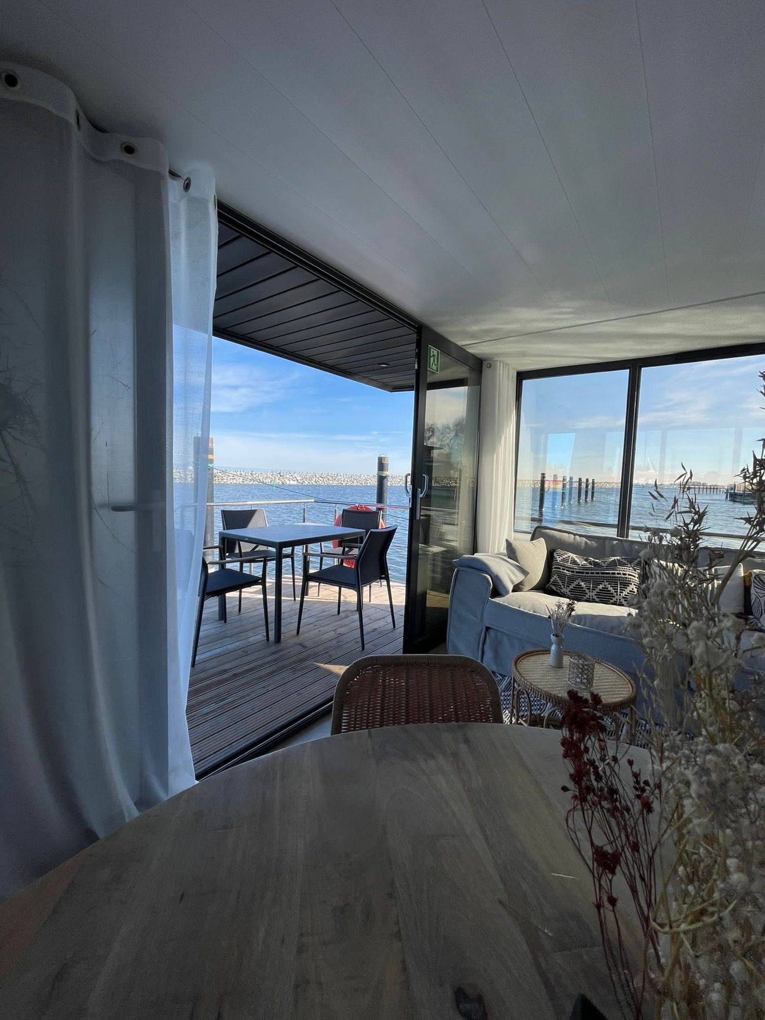 Im Wohnraum befindet sich ein Esstisch, ein gemütliches Sofa und eine Pantry-Küche. Bei schönem Wetter können die großen Schiebetüren zur Terrasse mit weiterem Esstisch geöffnet werden. Bodentiefe Fenster ermöglichen einen schönen Ausblick auf Wasser, Ufer, Schiffe, Möwen, ...